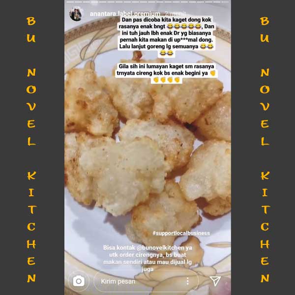 Cireng kribo dibuat dengan bahan baku premium tanpa bahan pengawet dengan tekstur cireng yang lembut didalam, dan gurih diluar sehingga memberikan cita rasa yang lezat untuk dinikmati dengan bumbu rujak yang pedas.